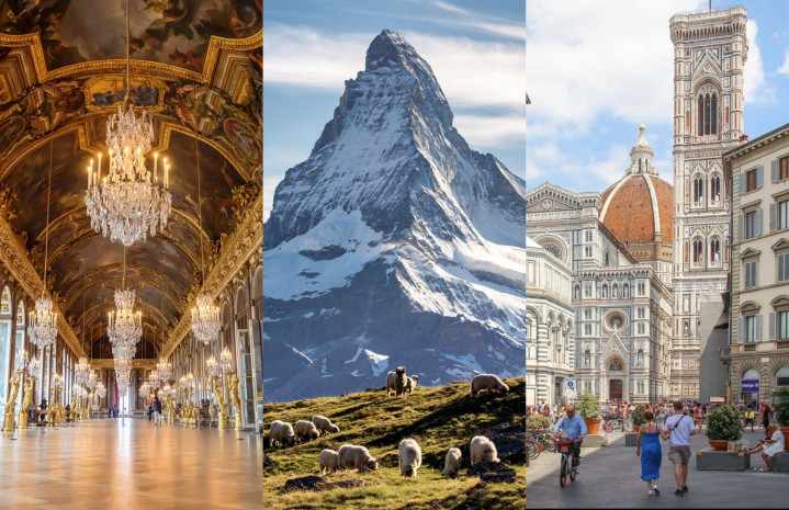 🗺️阶梯提倡(参考图2):法国(巴黎)→ 瑞士(因特拉肯-卢塞恩)→ 意大利(米兰-威尼斯-佛罗伦萨-罗马)