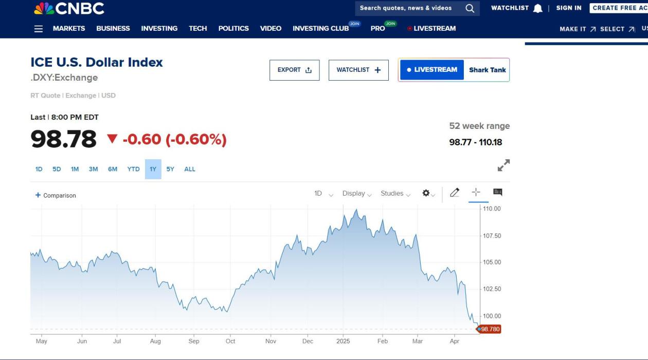 掂量好意思元对六种主要货币的好意思元指数近期握续走低。为止北京技术4月21日8时,洲际交游所好意思元指数报98.78,跌幅0.6%,跌破99关隘,为2022年4月以来初度。