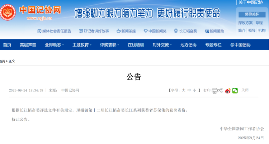 9月24日体育游戏app平台,中国记协发布《公告》:字据长江韬奋奖评比文献相关规章,现取销第12届长江韬奋奖长江系列获奖者苏保伟的获奖阅历。
