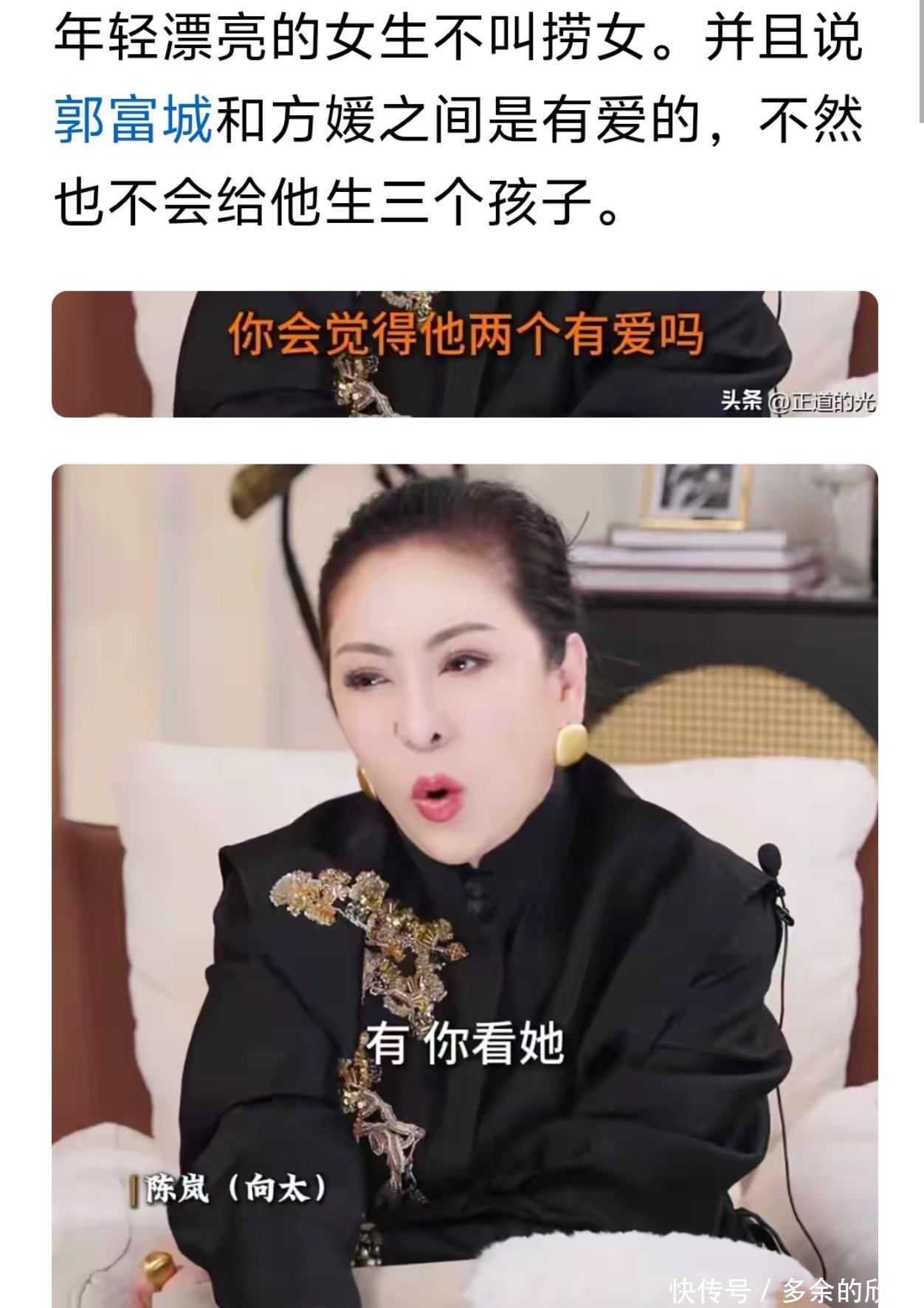 1月5日,向太陈岚在冒昧平台发布视频,火力全开为郭富城细君方媛正名。面临流传多年的“方媛出生名媛培训班”外传,她尖锐反问“谁有阅历教名媛?谁敢跳出来承认?”,直言这类标签肃肃离奇乖癖,当代东说念主靠影视、AI就能自学礼节,无需刻意包装。更怒怼“捞女”标签臭名化女性,抛出灵魂拷问:“为什么独一捞女莫得捞男?”,刺破性别双宗旨痛点。