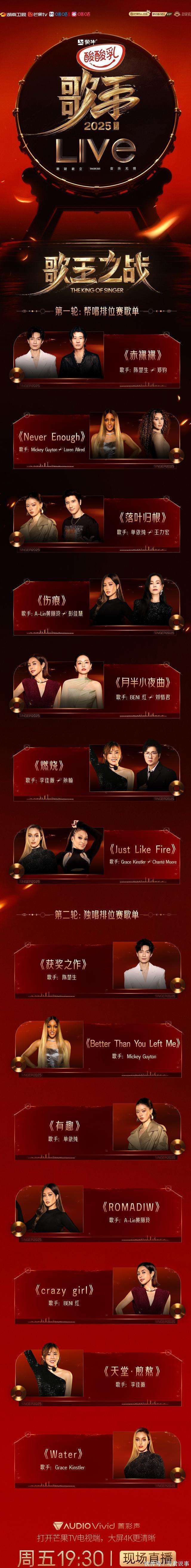 8月8日,《歌手2025》“歌王之战”总决赛将于湖南长沙七彩盒子举行,并于19:30在湖南卫视、芒果TV等平台直播。 今天一早,总决赛的终极歌单厚爱发布,7位“歌王候选东说念主”将继承两轮竞演的形式空洞决出终末排名,第一轮是与各自的帮唱嘉宾完成齐唱歌曲,第二轮则是演绎各自的独唱曲目。有别于上一季总决赛帮唱模范淘汰的歌手无法参加第二轮竞演的赛制,本年每位“歌王候选东说念主”都将完好演绎我方准备的两首歌曲。