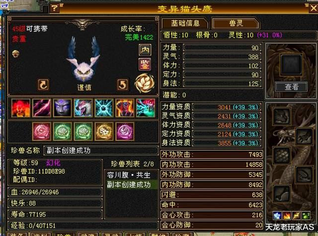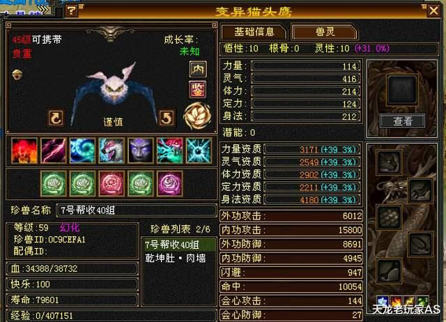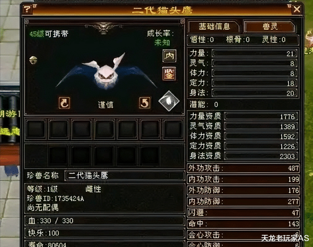 传奇,这是咫尺全服第一猫头鹰,裸禀赋高达2303!这禀赋是太吓东说念主了,按照山河YY统计的卡级宝宝极限禀赋,猫头鹰的极限禀赋是2322!