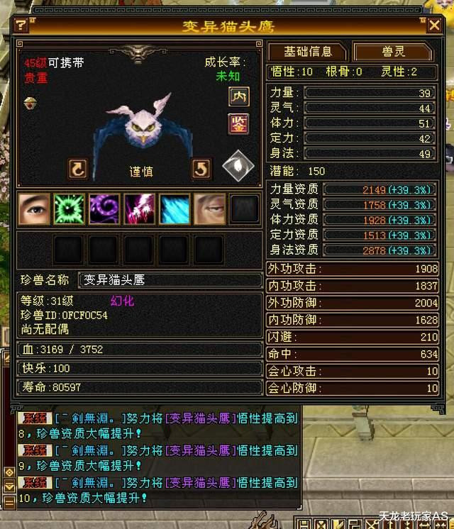 还有【梦回苍山】的卡49级7级天山身上的4180严慎猫头鹰,这只裸禀赋2290,算是全服第二猫头鹰吧~