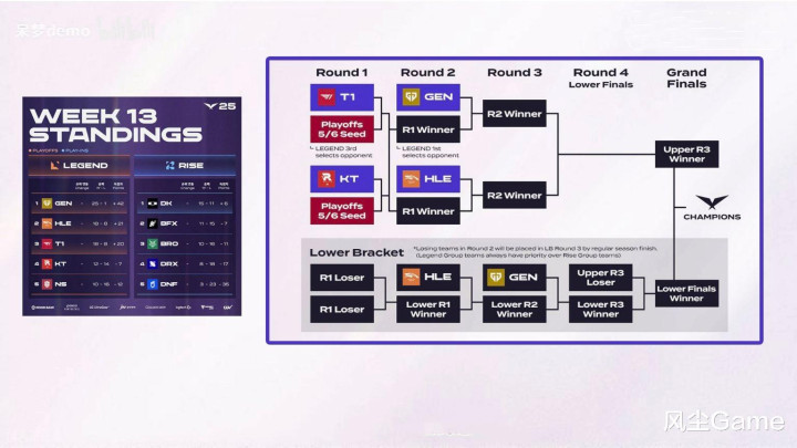 本年LCK赛区取消了冒泡赛,季后赛剿袭的是双败赛制,跌入败者组的队伍,不是像LPL相似,径直顺位下放,而是把柄通例赛排行,来决定下放到哪个位置,拿GEN来举个例子,他们通例赛排行是第一,如果下一场比赛输给KT,跌入败者组的话,GEN就会被径直分到败者组第三轮。