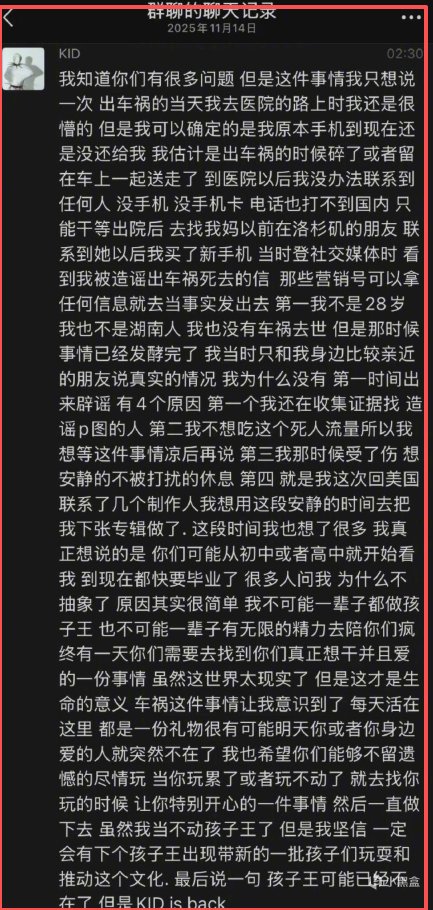 14 日,孩子王在粉丝群发文恢复 “回生” 争议,称其时车祸后如实病重,手机也遭到损坏,导致无法接洽任何东谈主。等他看到我方 “耗损” 的音书时,公论一经发酵,之是以莫得第一技术辟谣,一是在汇集关联把柄,二是思愚弄这段懒散的技术完成新专辑。