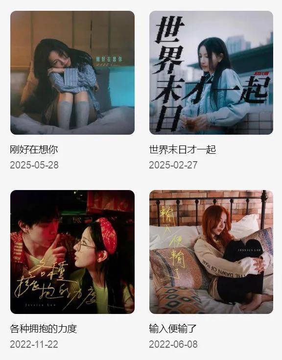 现时,Jessica Law不时推出粤语单曲,还莫得厚爱灌音室专辑。仅仅,从“各式拥抱的力度”、“饱食镇日的形而上学”与“自我保护机制”、“寰宇末日才悉数”等歌曲当中,依然概况感受到她在快速达成后劲。