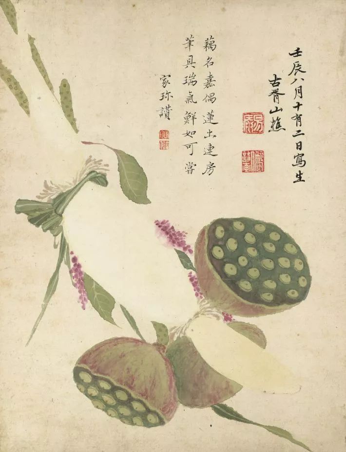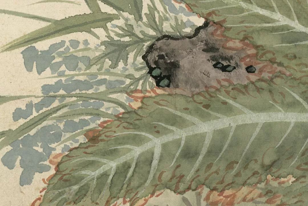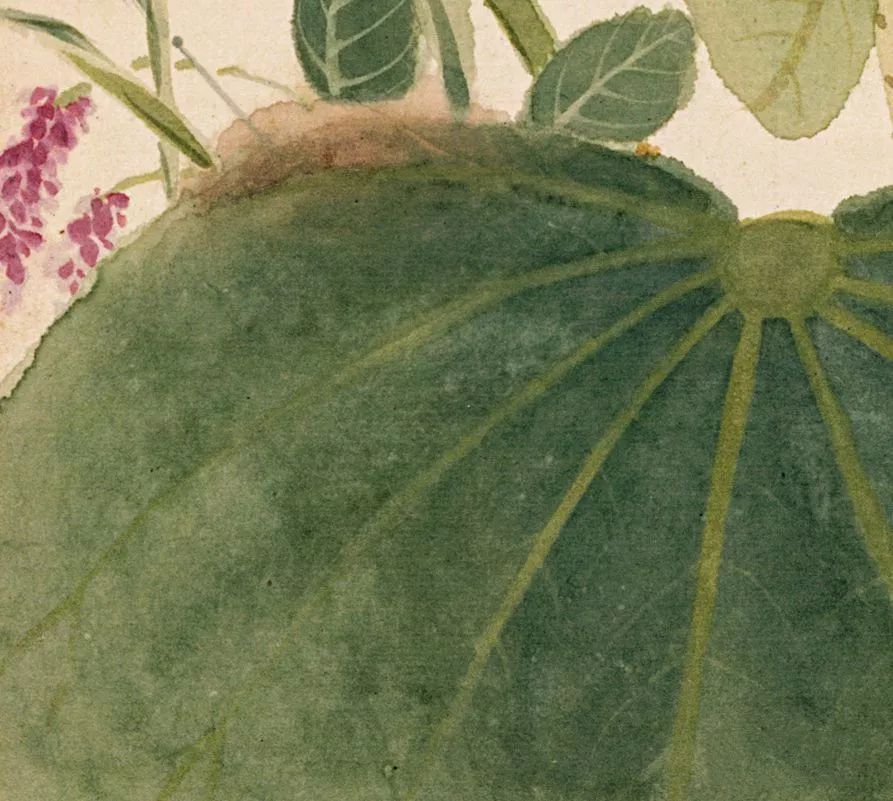 荷花荷叶,新鲜得跟刚洗过澡似的。荷花黄花少年,荷叶平铺了得,水草穿插其间,仿佛能听到那“哗哗”的水声。莲蓬莲藕,弥漫充实,莲藕竟然沿途留白,莲蓬则以绿色和胭脂勾画皴擦,一虚一实,一简一繁,看得东说念主直呼遍及。