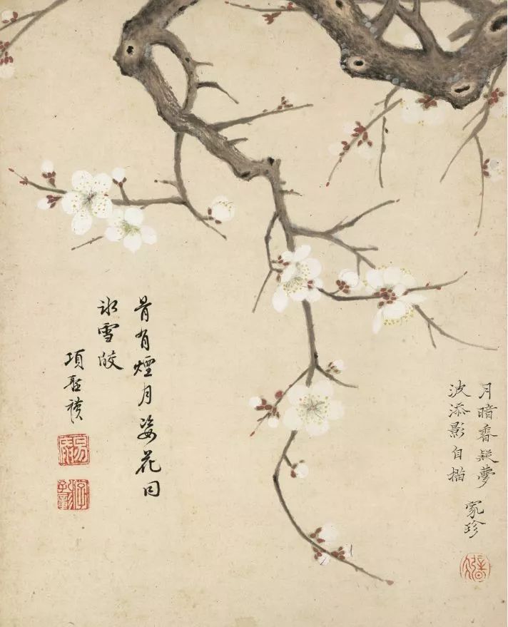 白色桃花和梅花,淡雅得跟少女下凡似的。白色桃花,花瓣边际带点浅粉,中心晕染得稍深,娇嫩得跟婴儿的脸蛋相似。白色梅花,枝干苍古,花朵结拜,暗香疏影,仿佛能闻到那股冷香。
