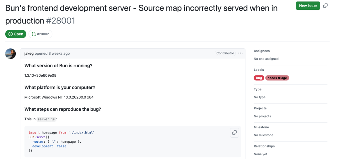 地址:https://github.com/oven-sh/bun/issues/28001