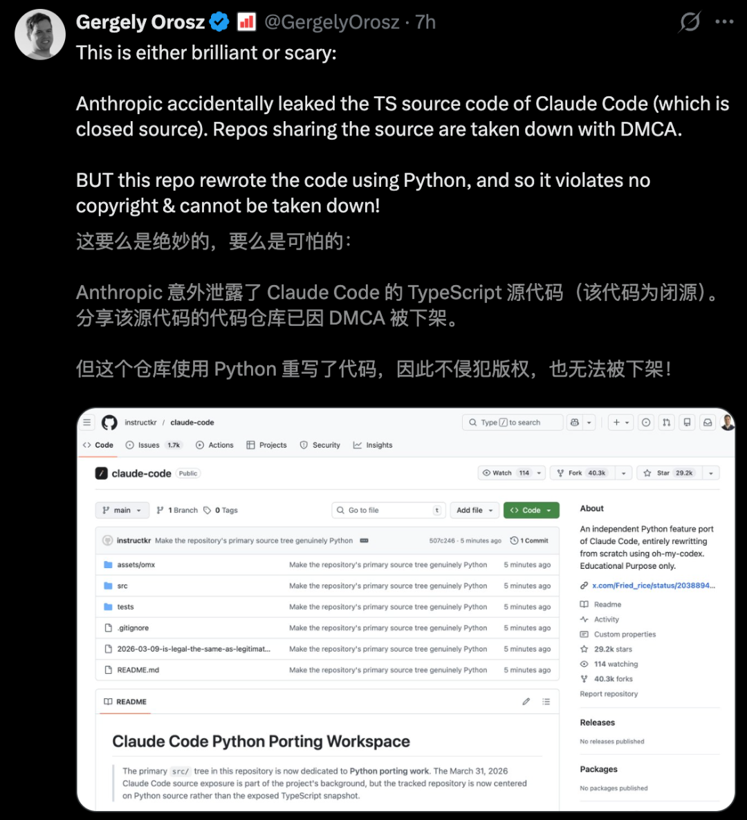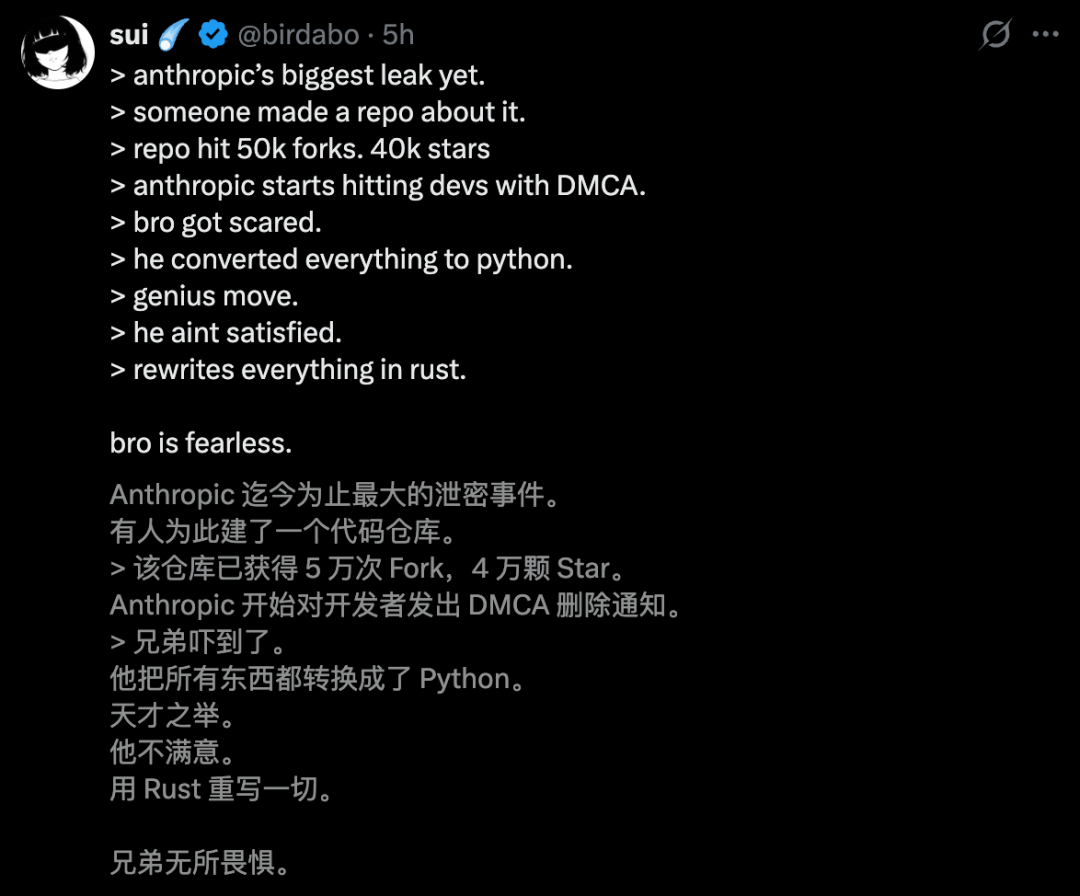 借用Codex力量,他赶在天亮之前,硬生生地用Python把Claude的中枢逻辑,从0开动重写了一遍。
