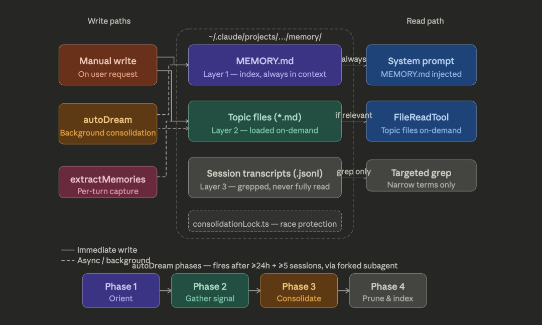 缅思分四类,user(画像)、feedback(矫正)、project(现象)、reference(指针)。同期列出「绝对不记」清单,代码模式、Git历史、调试决议,grep和git log能查到的不该占缅思空间。