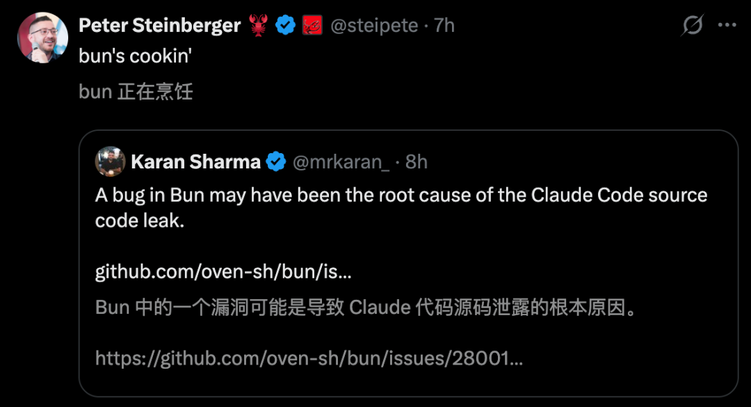 另有开发者发现,此次泄密可能是Bun中的一个缝隙导致,就连OpenClaw之父皆下场关心了。