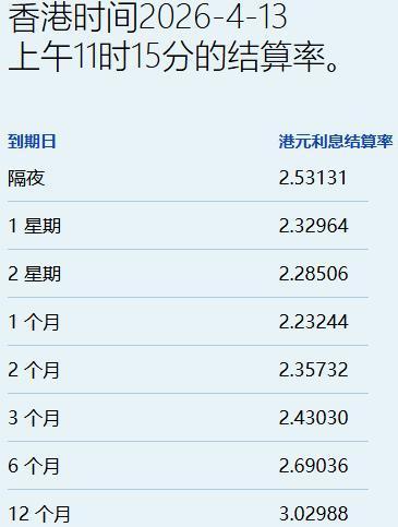 隔夜息报2.53131%亚博体育(中国)官方网站,跌4.899基点;一周拆息跌7.036基点,报2.32964%,两周则升1.137基点,报2.28506%。长息方面,六个月拆息跌0.964基点,报2.69036%,一年期则升0.143基点,报3.02988%。