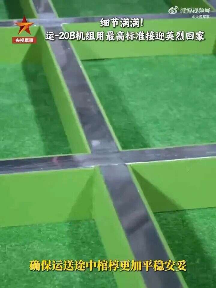 为了接迎英烈回家,运-20B机舱内大地都铺上了军绿色地毯,棺椁架已装配完毕,为了更好地将其固定,队列官兵亲手设想制作了专用系留锁。每一处内侧四周,还注目贴好了防撞条,确保输送途中棺椁牢固适宜。
