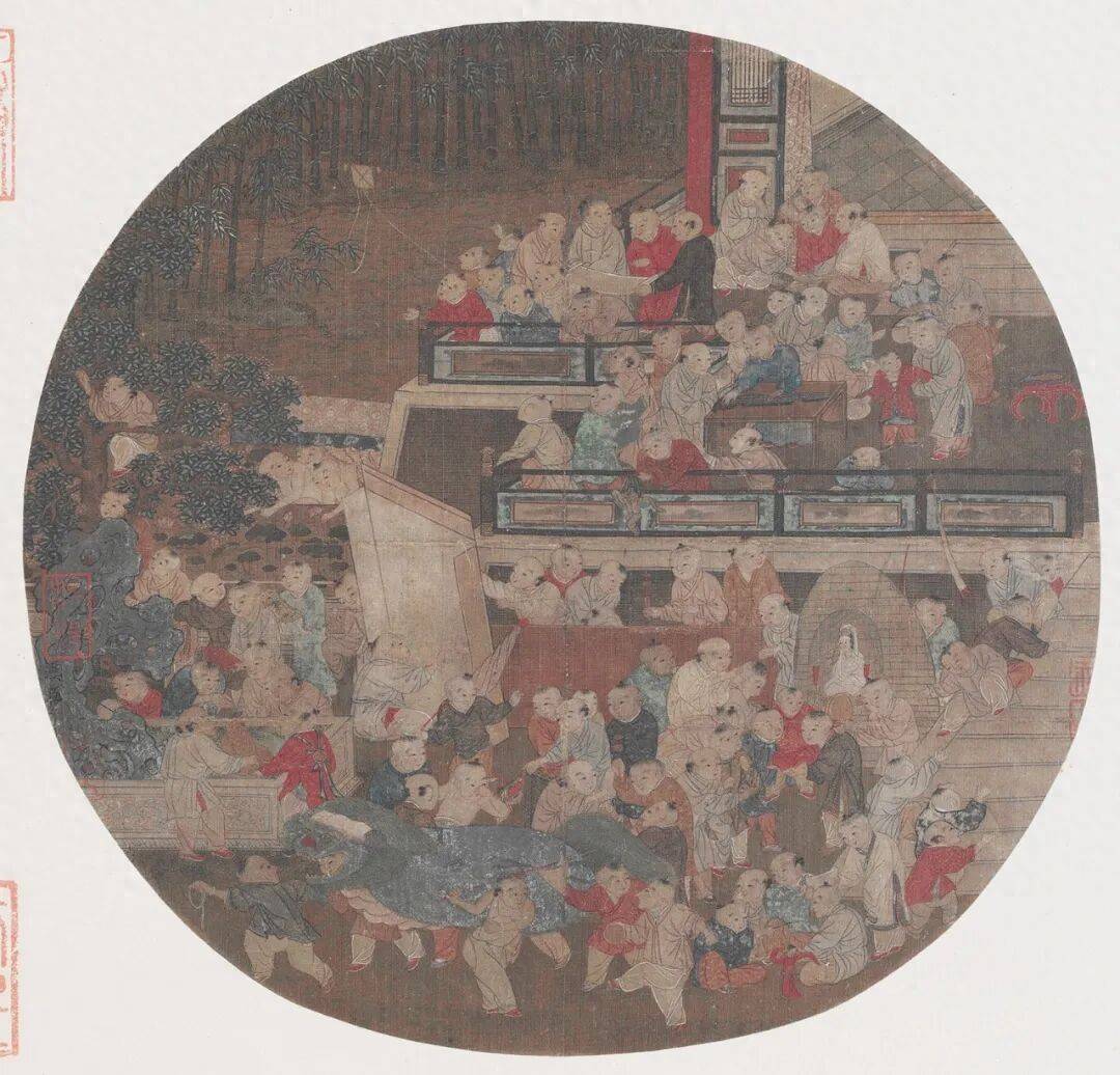 苏汉臣《百子嬉春图》以26.6×27.7厘米的纨扇绢本,将百名孩童的嬉戏场景浓缩于方寸之间,看似是宋代宫廷画家对“多子多福”的空闲寓意的直白抒发,实则讳饰宋代社会文化、习尚信仰与儿童表情的深层密码。