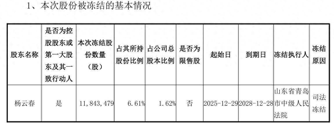 2025年12月31日晚间,赛微电子(300456)发布公告称,公司接到控股鼓吹、本色限制东说念主、董事长杨云春书面见知,获悉其所握公司1184.35万股份被执法冻结,占其所握股份的6.61%,占公司总股本的1.62%。